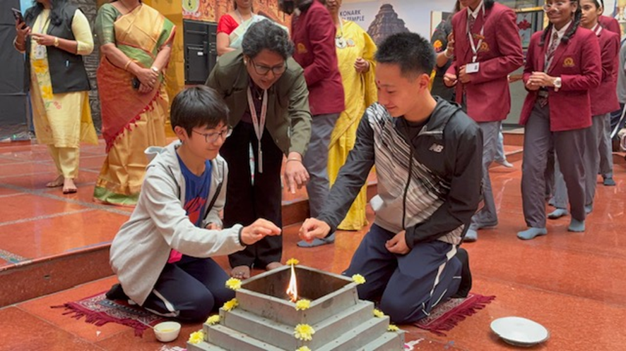 校内に移動し、最初に体験したのはヒンドゥー教の神々への長寿祈願。お祈りの歌に合わせて米粒や花を火に投じ、祈りを捧げるという貴重な体験でした。