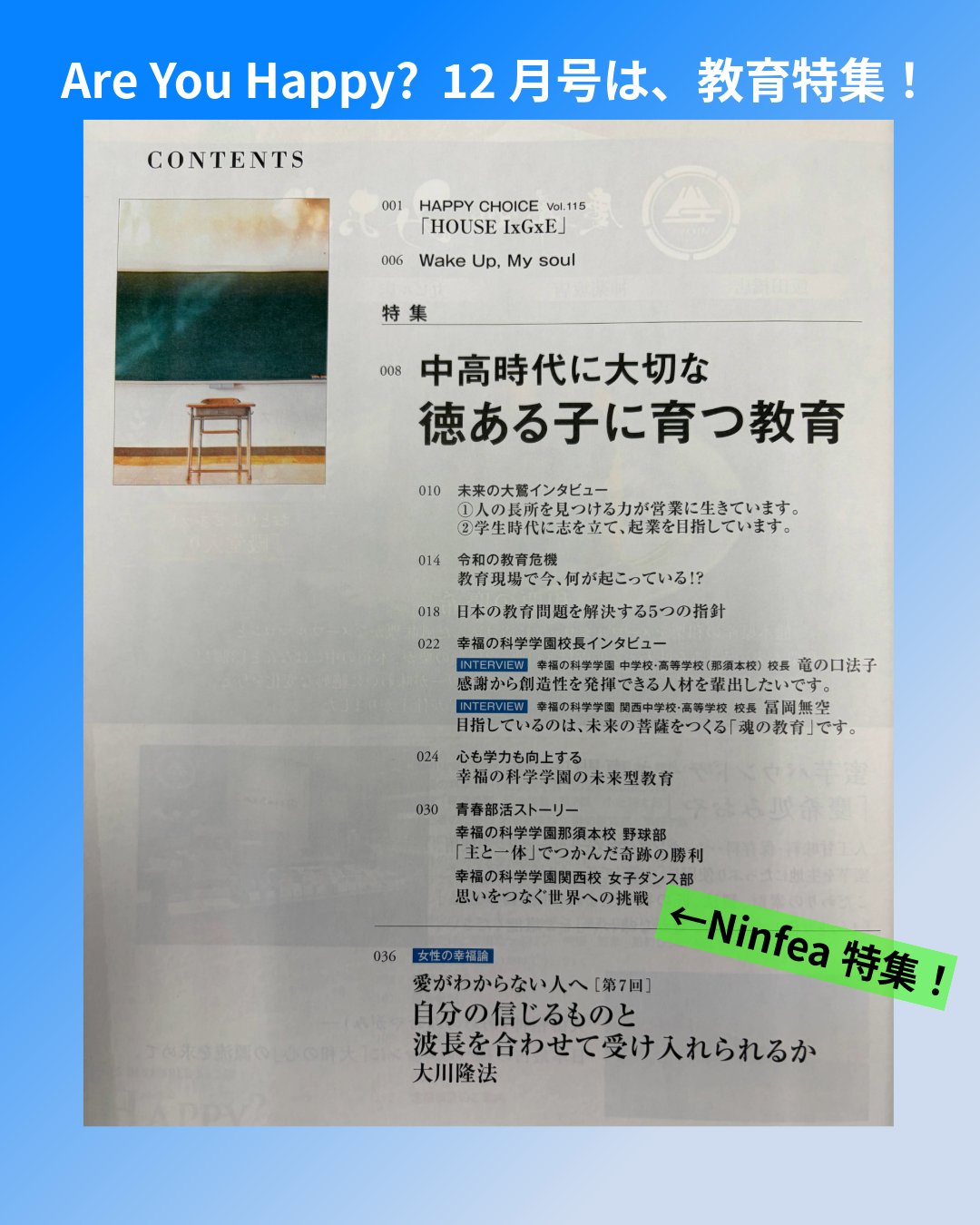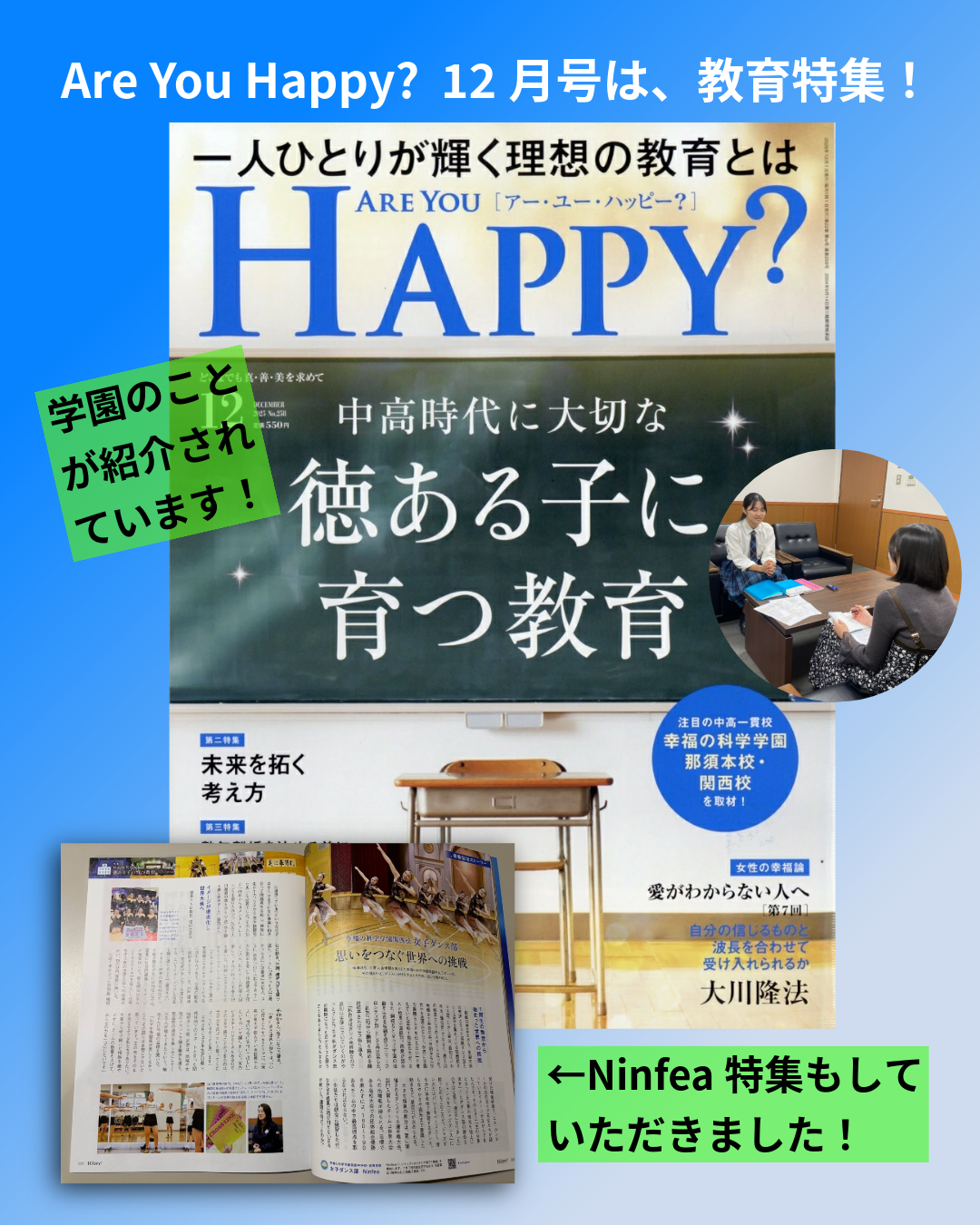 Ninfea★Are You Happy? 12月号で紹介していただきました! 2025.11.26 女子ダンス部 『Are You Happy?』12月号は、中高時代に大切な「徳ある子に育つ教育」の特集です。 幸福の科学学園が目指していること、大切にしていることなどを、卒業生の活躍や校長先生方のインタビュー、学園生活や寮生活の取材を通してまとめられています。 日本の教育問題を解決する指針も掲載されています。 是非ご覧ください!