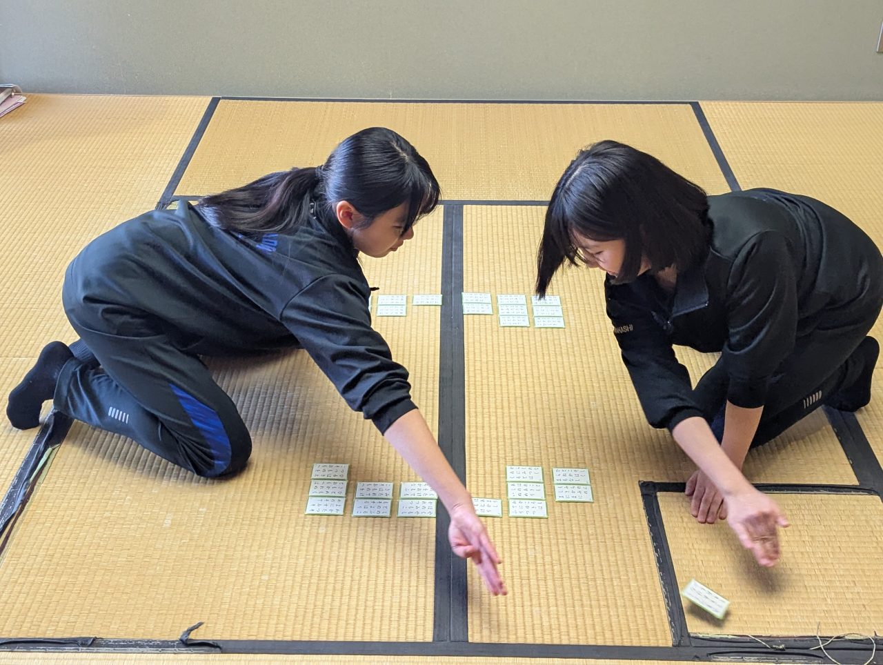 かるた部とは 2025.12.19 部活動かるた部 理念:明鏡止水 ~静と動を磨く~ [速報]大会結果!☆11/23(日)の奈良大会(E級)…中3女子ベスト4(D級に昇級)!☆12/7(日)の須磨千鳥かるた大会(E級)…中3女子優勝! 私達かるた部は、月・水・土の週3回行っています。また、昼休みに体幹・素振りとやっています! 主な部活のメニューは札流し(100枚すべての決まり字を言う)、札払い、体幹、練習試合です。ぜひ遊びに来てください!!